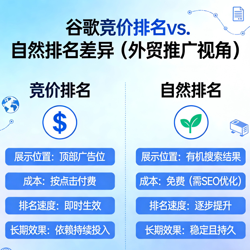 在谷歌推广体系中,自然排名通常被视为“长期战略”,而竞价排名则是“短期获取流量”的重要手段。