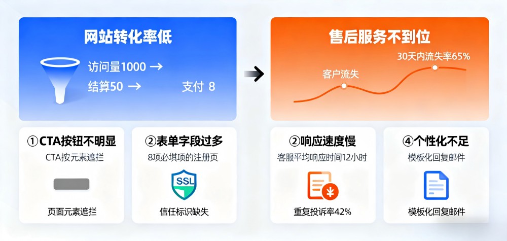 问题表现:界面杂乱、导航不清晰、移动端体验差,影响用户浏览和转化。