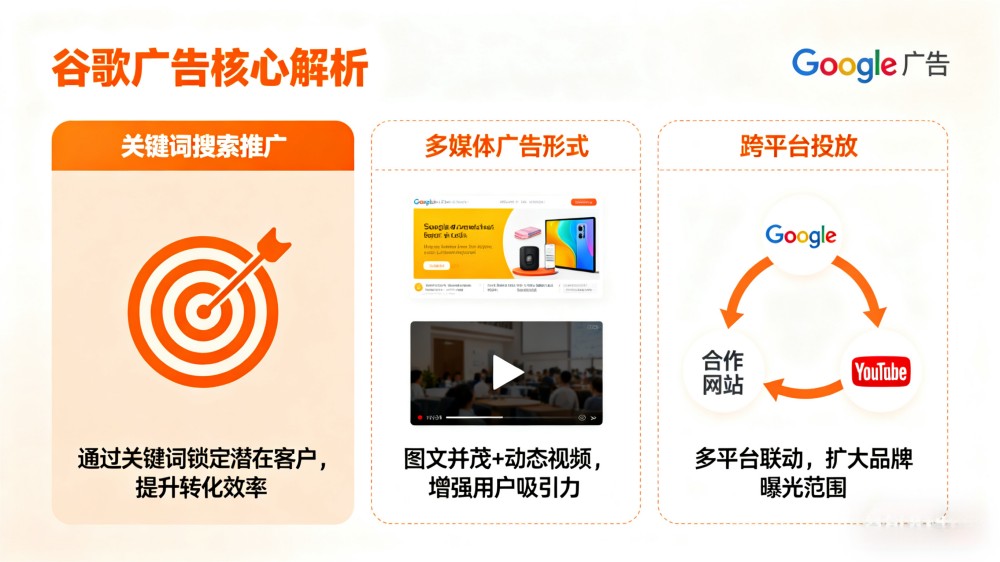 根据广告目标和预算,企业可以选择适合的谷歌广告类型。搜索广告是最常见的广告类型,当用户在谷歌上搜索特定关键词时,搜索广告会出现在搜索结果页面的上方和下方。展示广告可以在谷歌合作伙伴网站上展示,形式多样,包括图片、动画和视频等。购物广告专门为电子商务企业设计,可以在谷歌搜索结果页面上展示产品图片、价格和描述等信息。视频广告可以在 YouTube 和其他视频平台上播放,吸引用户的注意力。应用广告则是针对移动应用开发者设计的,可以在谷歌搜索、谷歌 Play 商店和其他应用平台上展示。