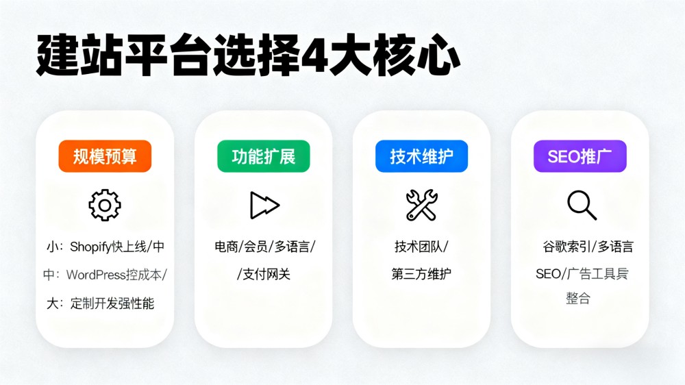 选择合适的外贸网站建设平台应结合企业规模、预算、功能需求、SEO优化和技术能力。