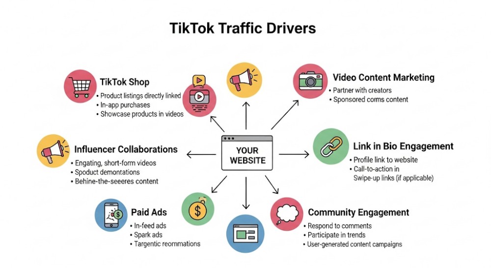 📌 专业建议:在TikTok简介中放置 独立站链接 + CTA(行动号召),例如“Shop Now 👉 www.xxx.com”。 - 内容营销引流(自然流量)