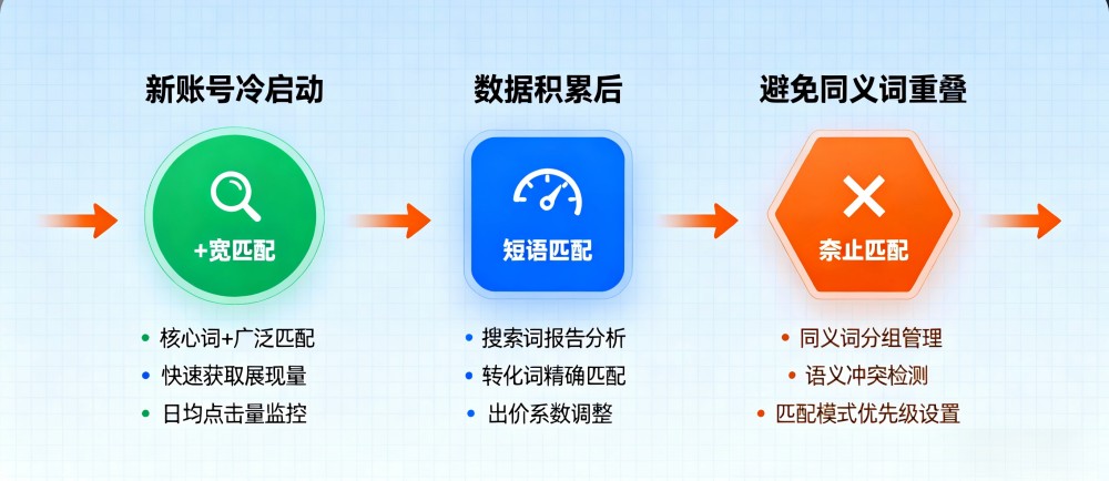 1.新账号冷启动:精准+词组匹配组合,防止预算浪费;