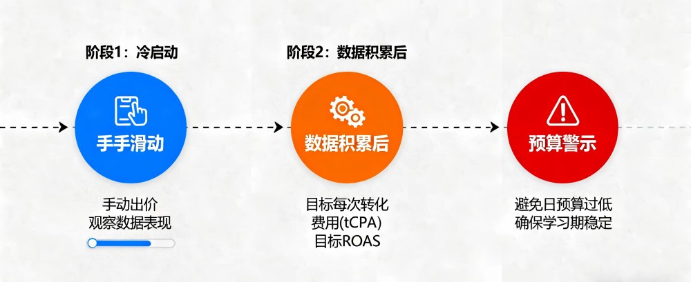1.新账户冷启动:建议先使用手动出价观察数据;