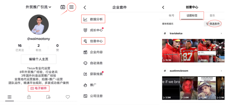 这时候用手机登录账号,就可以在资料修改那里添加企业邮箱了,企业套件里面有几个功能还是不错的,如数据分析和创业中心,数据分析可以看到账号视频的数据信息,创意中心则为你提供相关行业标签的创作灵感。当达到1000个以上粉丝后可以挂网址链接和开通直播功能、抖店(通过特殊渠道可以免去这1000粉丝的限制)。